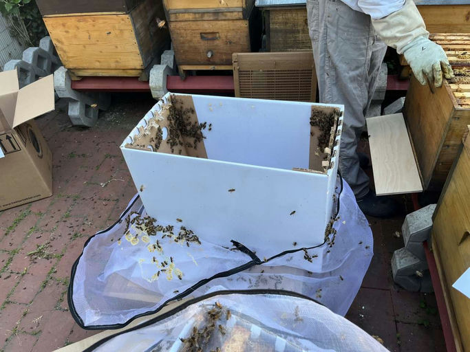 Die Königinnen mit genügend Bienen werden in die neuen Kästen einquartiert. Da sie neue Waben ausbauen müssen, um dort die Brut zu haben, wird mit einer Futtertasche gefüttert. Im April beginnt die B...