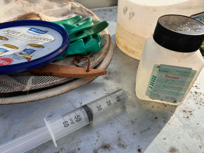 Gleich im Anschluss an die letzte Honigschleuder heißt es, die Bienen gegen die Varroamilbe zu behandeln. Ich verwende dazu 60%ige Ameisensäure im Liebig-Verdunster – das heißt, man muss ein Wetterfen...