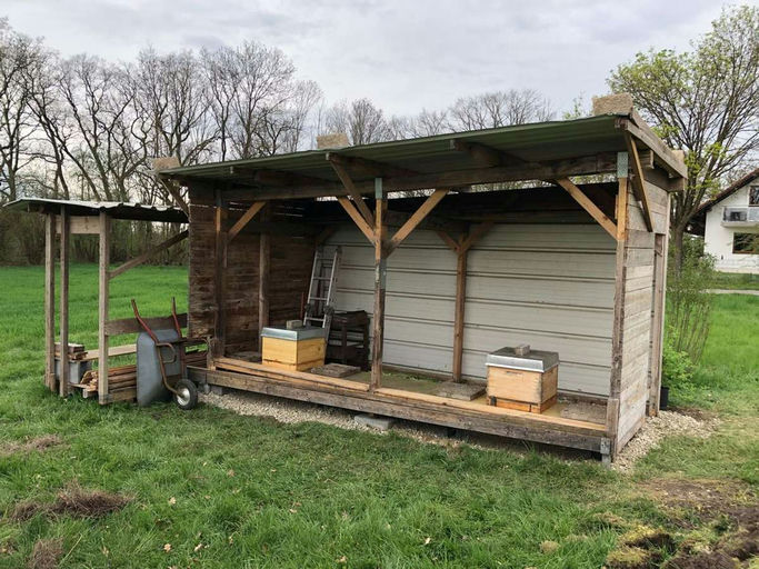 Die Kästen wurden eingekauft. Das Format ist Dadant US mit Absperrgitter und zwei Honigräumen. Nur außen wurde das Holz mit einer bienenunschädlichen Lasur behandelt. Die ersten beiden Kästen stehen b...