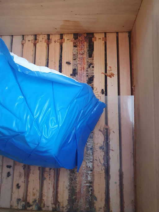 So sieht es aus, wenn die Imkerin mit dem Zuckerwasser bei der Fütterung daneben patzt. (Zum Glück nur im Inneren der Beute). Die Bienen stehen in Reih und Glied und strecken ihre roten Rüssel aus, u...