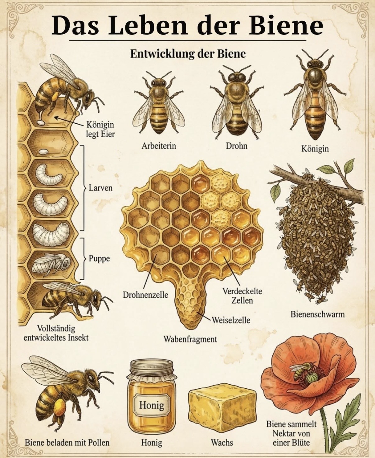 Wusstest du, dass das Leben einer Biene mit einem winzigen Ei beginnt? Die Königin legt ihre Eier in die sechseckigen Waben. Daraus schlüpfen Larven, die sich zur Puppe entwickeln – bis schließlich ei...