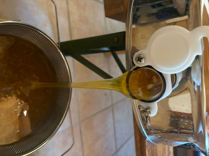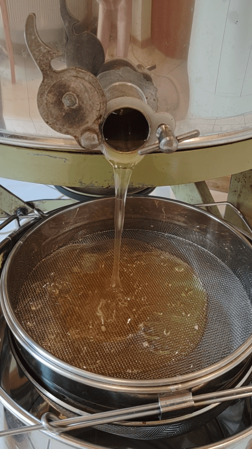 Um das Honiglager zu leeren, fülle ich den letzten Waldhonig vom Vorjahr in Gläser ab. Damit alles passt, wird er noch einmal durch ein sogenanntes Spitzsieb gefiltert. Da es ein eher zähflüssiger Hon...