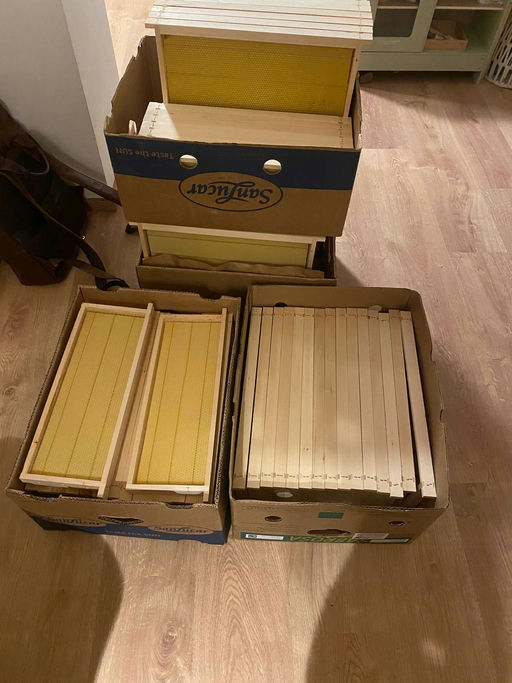 Die Beute wurde geliefert. Sie ist von sehr guter Qualität und sauber gebaut. Aufgrund der Witterung musste sie drinnen ausgepackt und aufgebaut werden. Die Rähmchen im Brutraum sind mit Biowachs-Mitt...