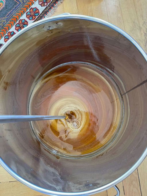 Die Honigausbeute dieses Jahres – die Bienen waren fleißig. Nachdem ich den geschleuderten und in diesem Jahr erstmals auch gepressten Honig durch ein Sieb gegossen und einige Zeit ruhen lassen habe ...