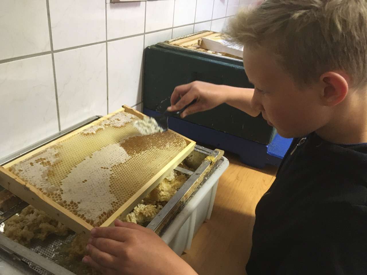 Auf diesem Bild sind wir bei Bernd in der Honigküche. Wir haben selbst noch keine eigene Schleuder und dürfen immer seine mitbenutzen. Er ist der Imker in unserem Dorf. Ich entdeckle gerade die Honigw...