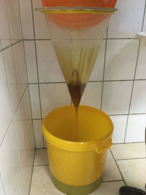 Hier sieht man, wie der Honig nach dem Schleudern durch ein Sieb läuft. Wachsstückchen und andere Teilchen werden herausgesiebt. Am besten schmeckt mir der Honig jetzt – ganz frisch. In den nächsten T...