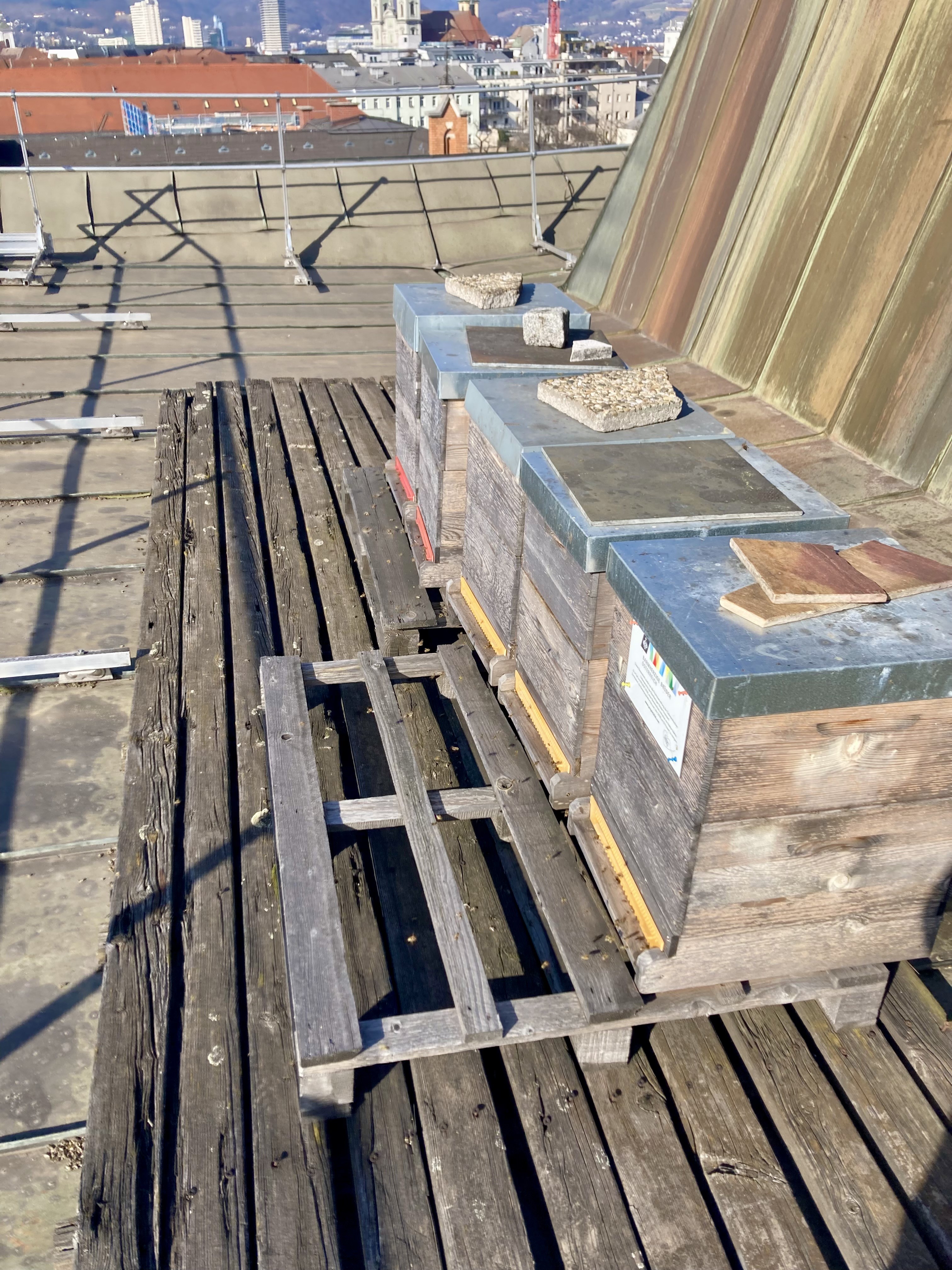 Die Bienen am Dach des Krankenhauses sind genau Richtung Westen ausgerichtet. Damit stehen sie genau in der Nachmittagssonne, und die Bienen fliegen bei meinem Besuch aufgrund der Wärme eifrig aus und...