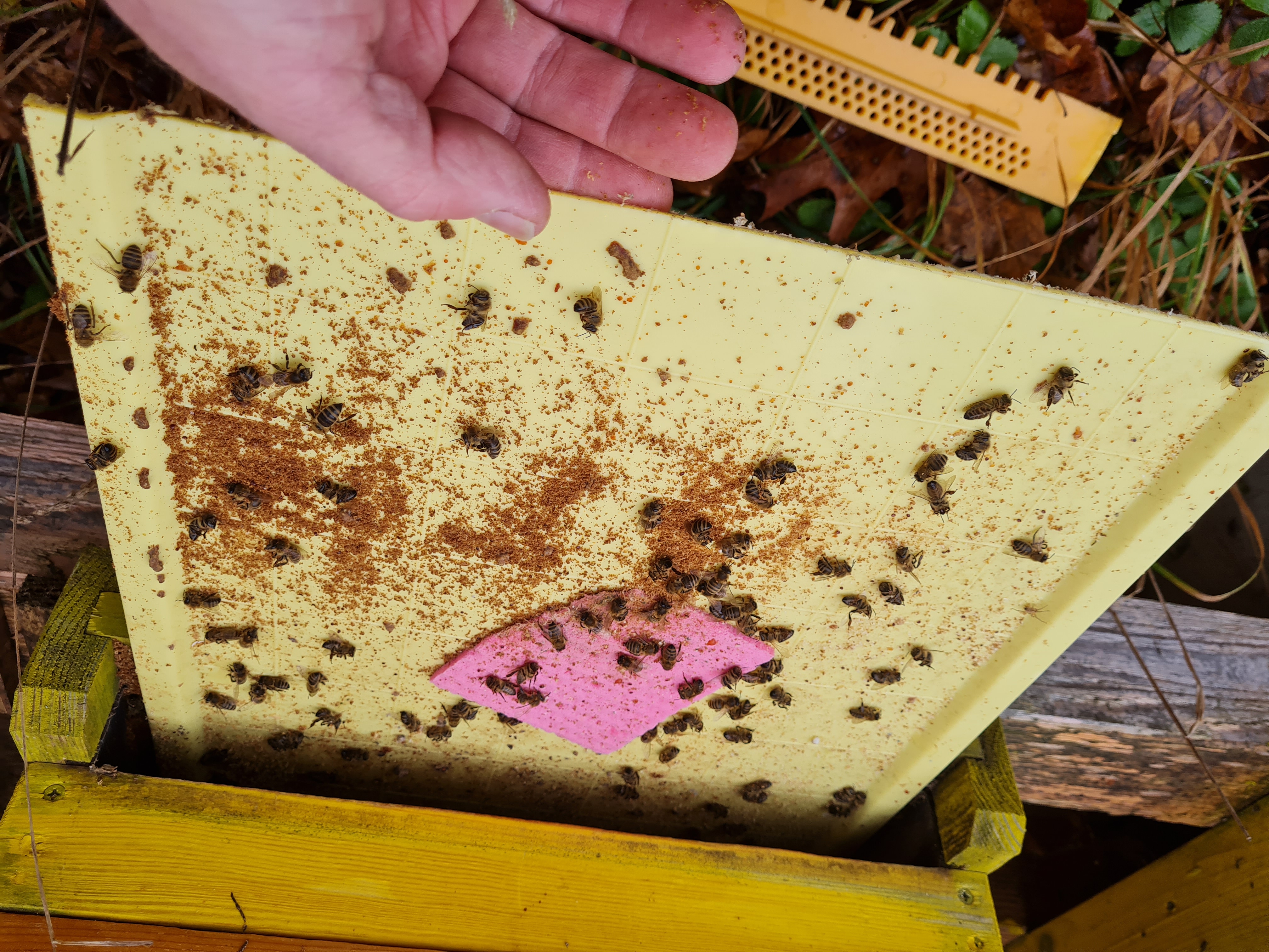 Es wurde erneut der Futterstand begutachtet und die Stockwindel auf die abgefallene Varroa kontrolliert und gezählt. Bei zwei Völkern ist extrem viel Wachsgemüll in der Stockwindel zu sehen. Ich höre ...