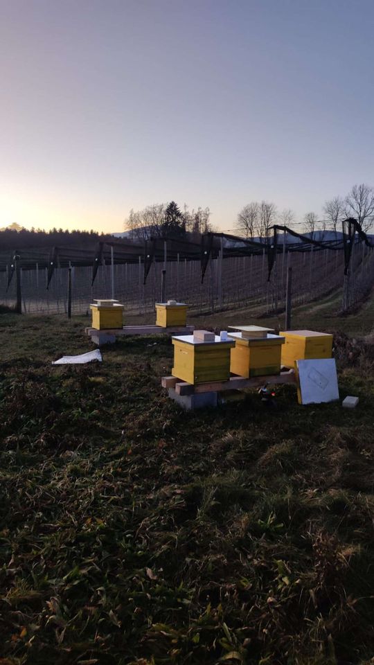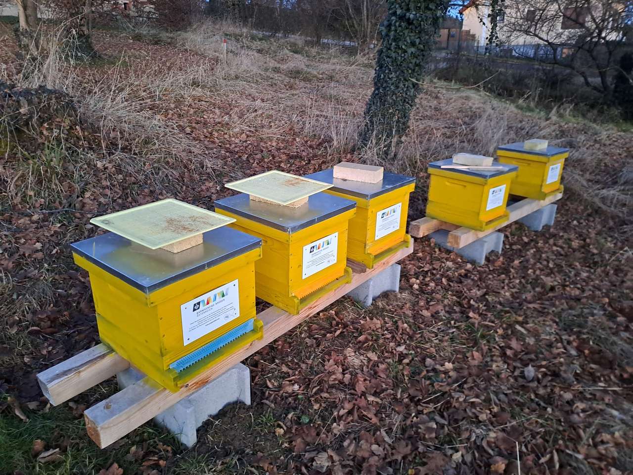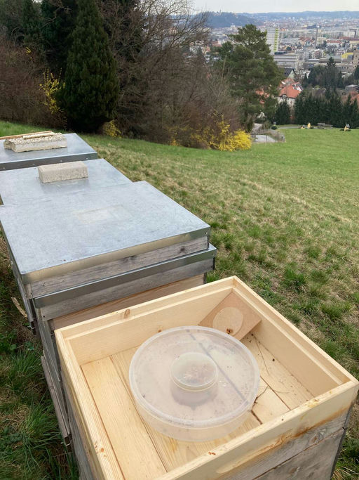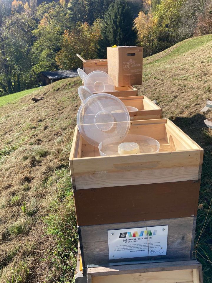 Bei warmen 22 Grad zu Mittag und blauem Himmel in Eggenberg auf der schönen Wiese der Barmherzigen Brüder gab es beim Wintercheck für die Bienen nochmals etwas Zuckerwasser, obwohl es noch wunderschön...