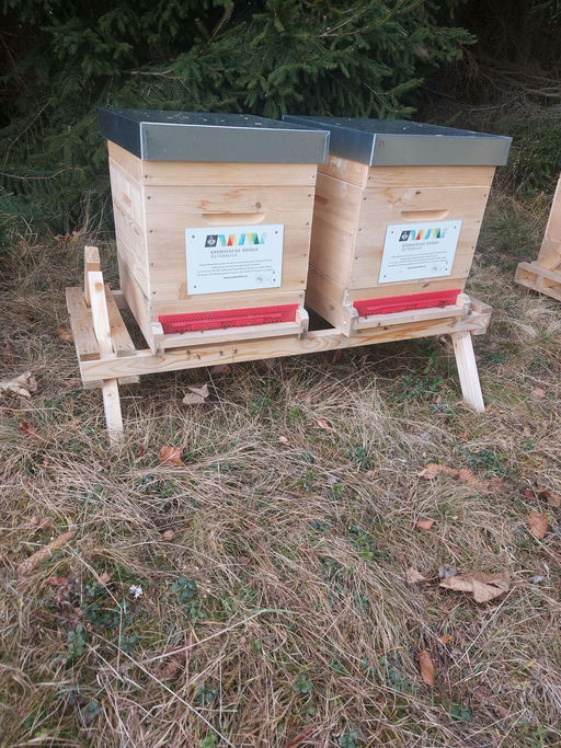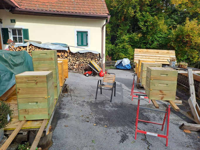 So, wir haben die restlichen Beutenlieferungen erhalten, jetzt geht's ans Färben. Nächstes Jahr wird dann von Vollzarge auf Jumbo umgestellt. Es waren keine Völker für Jumbo mehr zu bekommen, das Zeit...