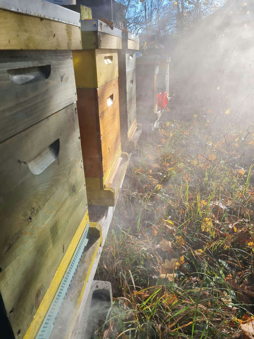 Im Dezember stand die finale Varroabehandlung an. Das Wetter hat gut gepasst, es war nicht zu kalt. Wir verdampfen Oxalsäure für die Restentmilbung, da denke ich, dass es besser ist, wenn die Wintertr...