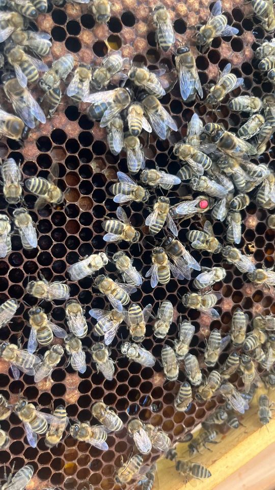 Nachdem es zwei Wochen am Stück durchgeregnet hat, war es Zeit, die Bienen in einer kleinen Regenpause zu füttern. Bei dieser Gelegenheit habe ich die rot markierte Königin gesehen! Königinnen werden,...