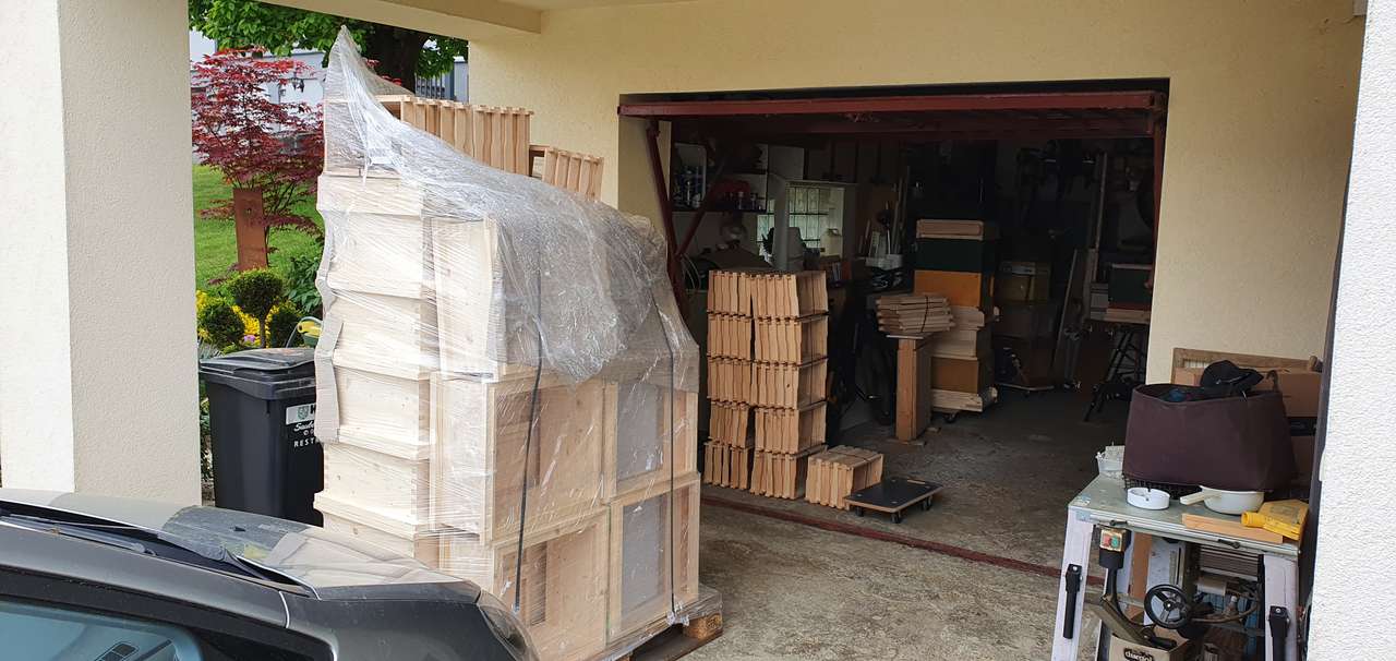 Endlich sind die Bienenbehausungen angekommen. Ich verwende das Deutsche Einheitsmaß mit zwei Bruträumen und einem Honigraum. Der Boden ist mit einem Gitter und einer Varroalade versehen. Hinten am Bo...